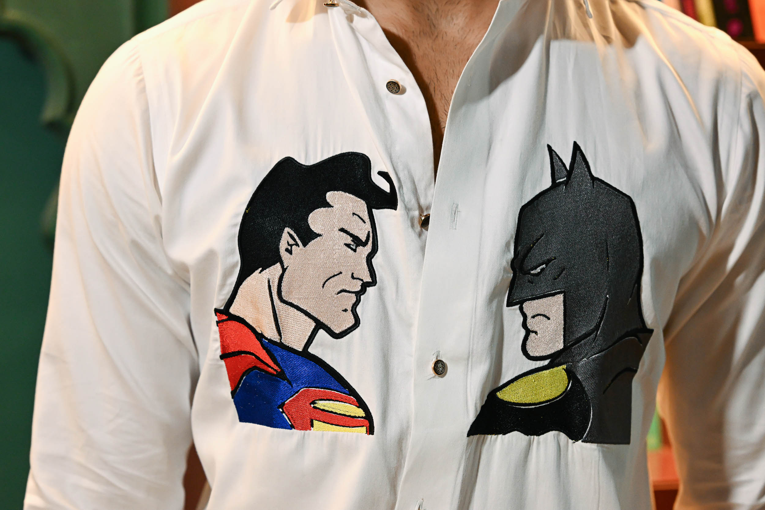 The front embroidery showcases a bold face-off between Superman and Batman, symbolizing strength and rivalry. Each character is depicted in a classic comic-style profile, with vibrant thread work capturing their iconic colours and expressions. The contrast between Superman’s bright primary hues and Batman’s dark tones creates striking visual drama. On the back, a unique combined emblem merges Batman’s bat silhouette with Superman’s “S” shield, symbolizing unity beyond conflict. Together, the front and back designs narrate a story of competition, respect, and alliance between two legendary heroes.