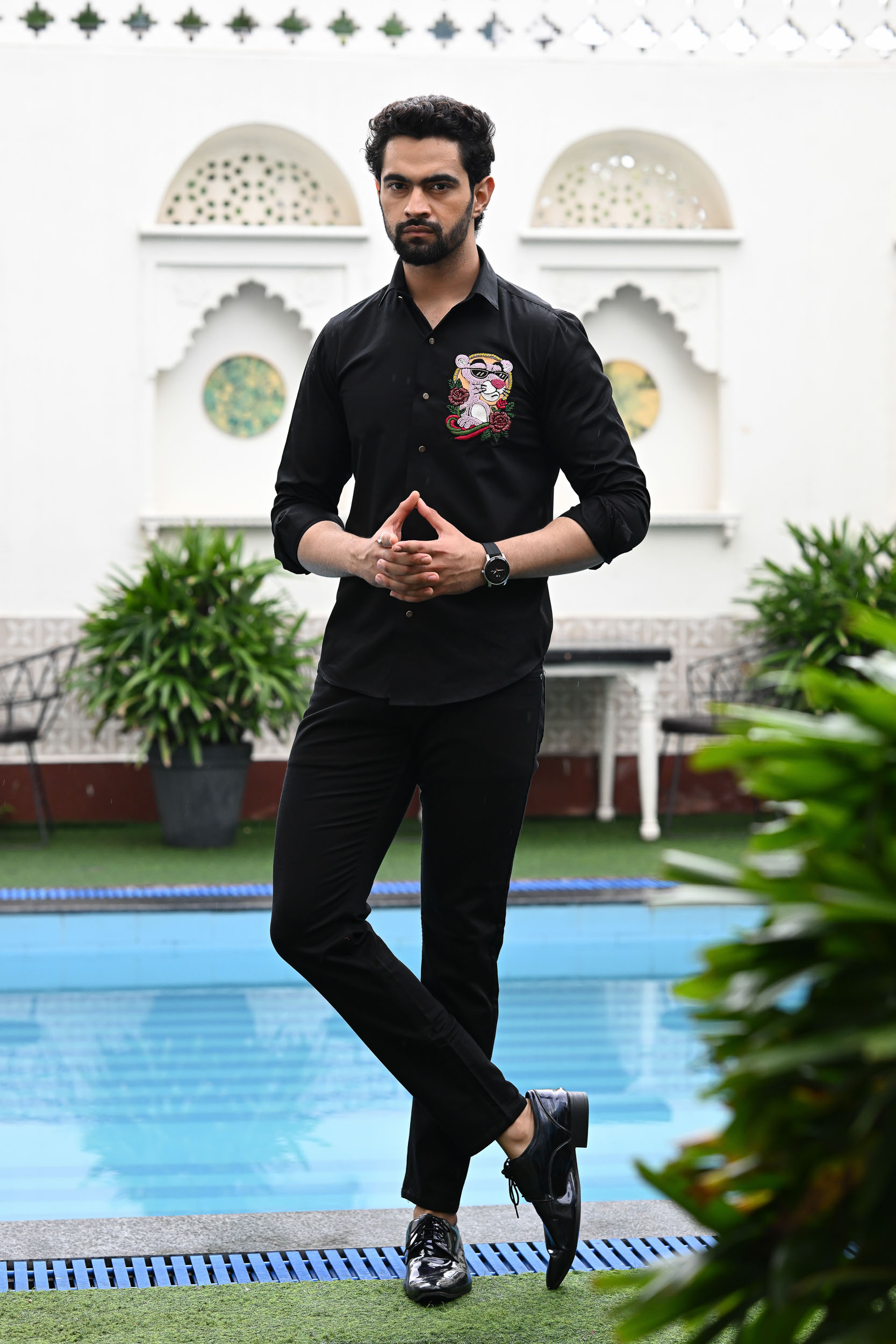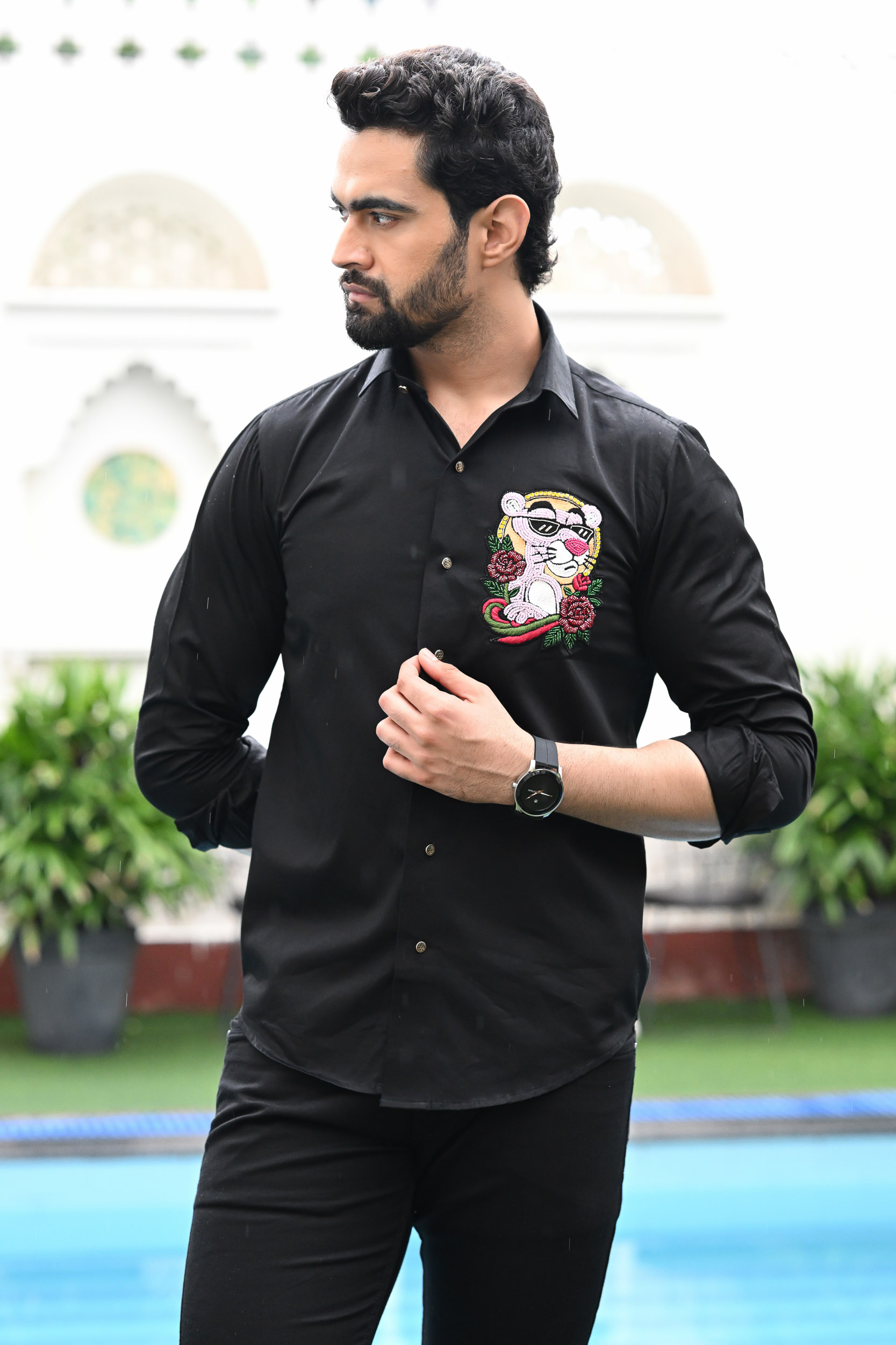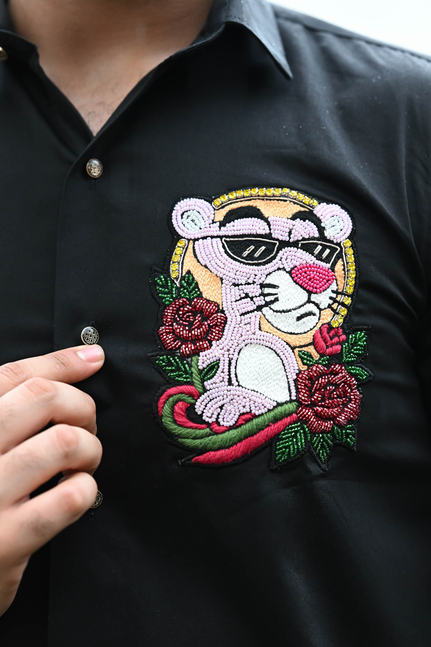 This design features a playful and stylish pink panther design, brought to life with intricate beadwork. The panther sports sleek black shades, giving it a cool and confident personality. Rich red roses and green leaves add a vibrant pop of colour and contrast to the black fabric. The golden bead halo around the head adds a luxurious, standout element. Perfect for those who like to mix fun, fashion, and bold statement art in their wardrobe.