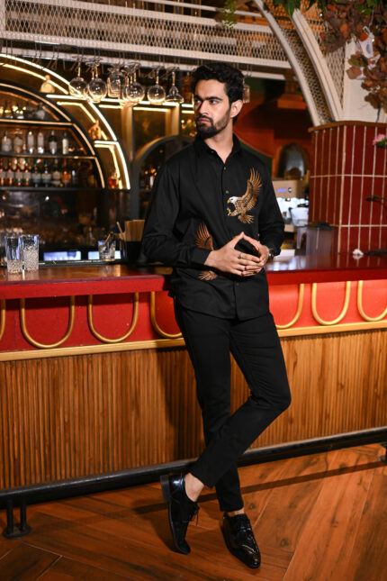 This shirt showcases a captivating marine-inspired design featuring a beaded turtle and jellyfish. The turtle sparkles in shades of green, gold, and bronze, symbolizing longevity and wisdom. The jellyfish shimmers with blue and silver tones, its flowing tentacles adding graceful movement. Both motifs are intricately hand-embroidered, standing out elegantly against the deep navy fabric. A perfect blend of oceanic charm and refined style for a distinctive, nature-inspired look.