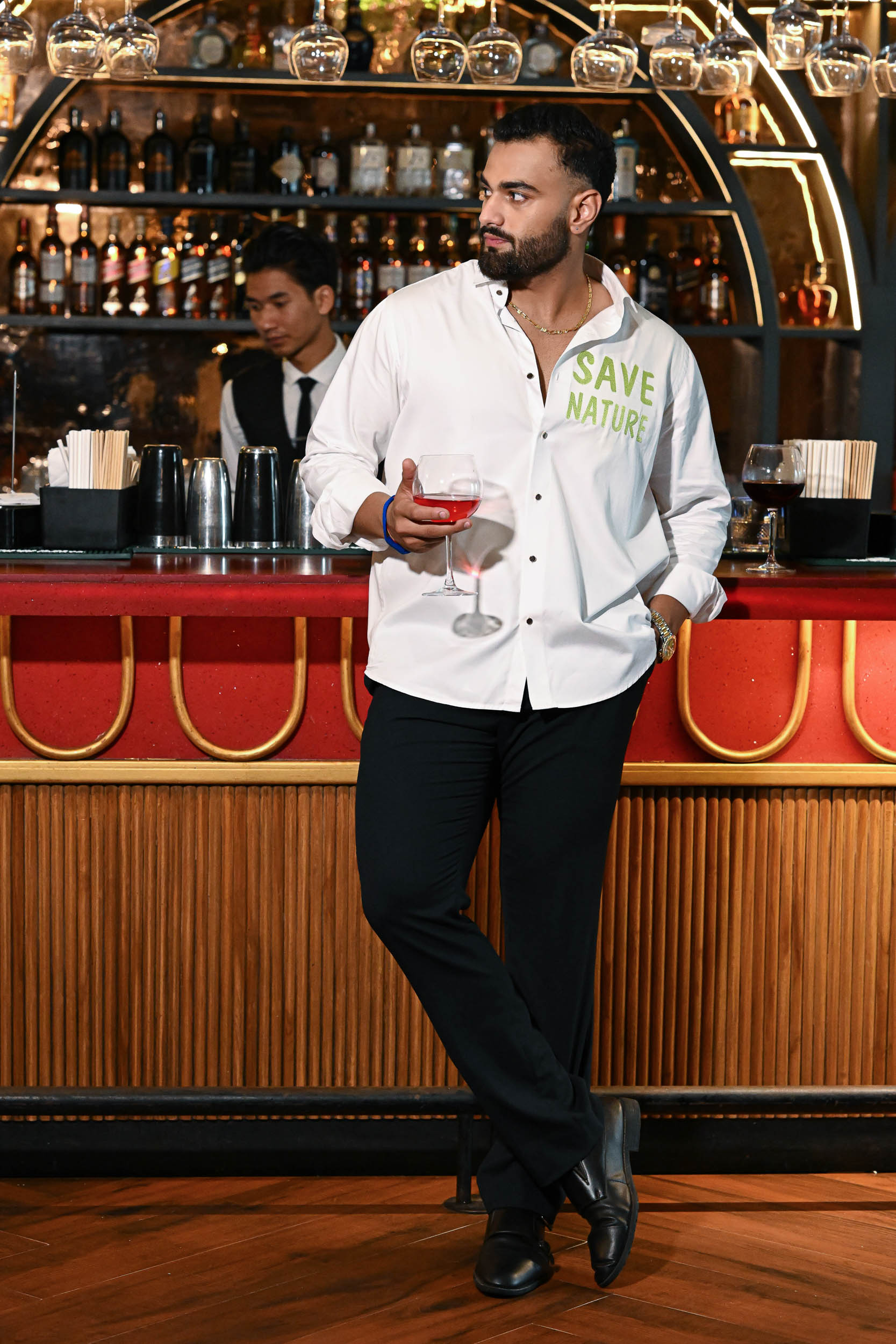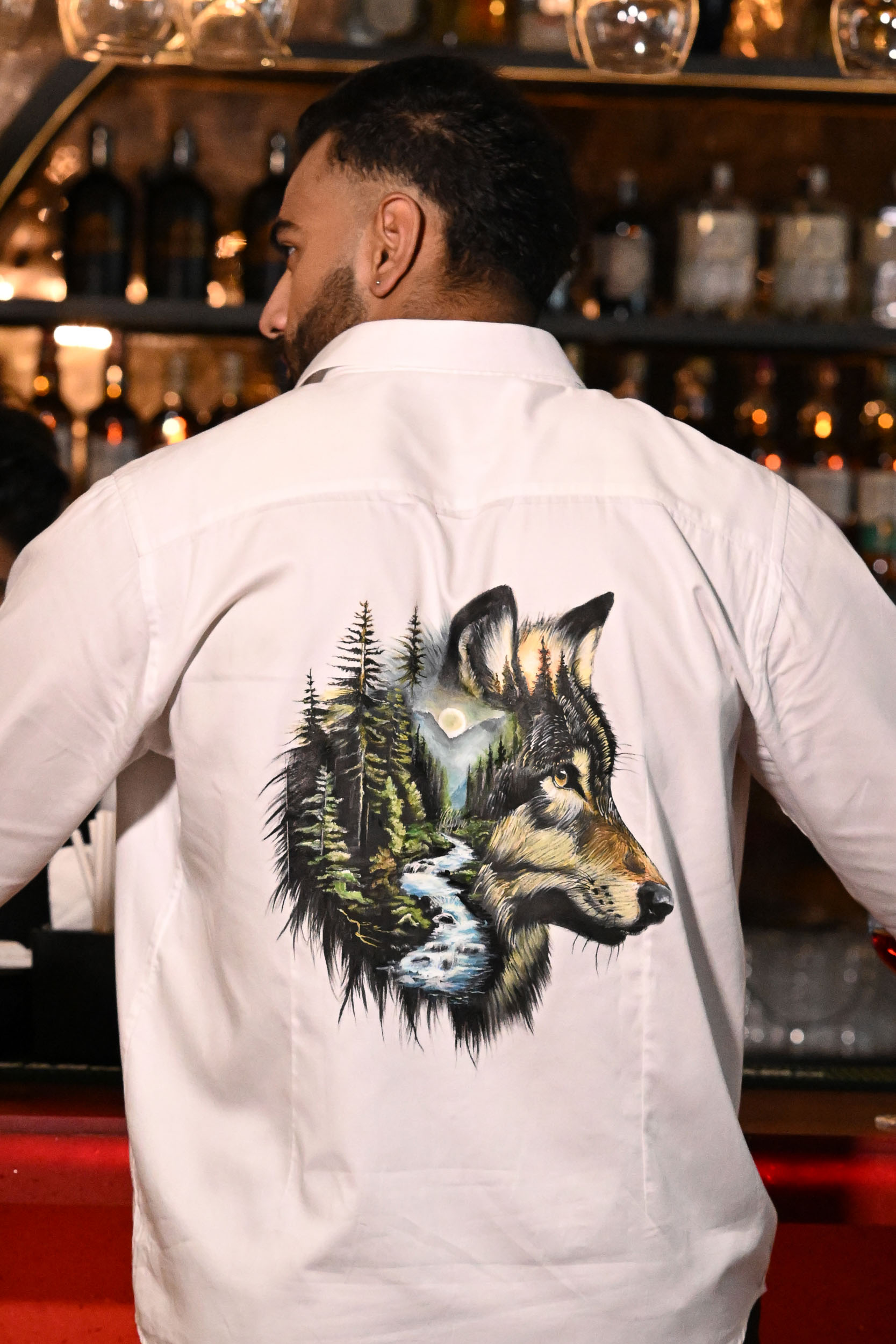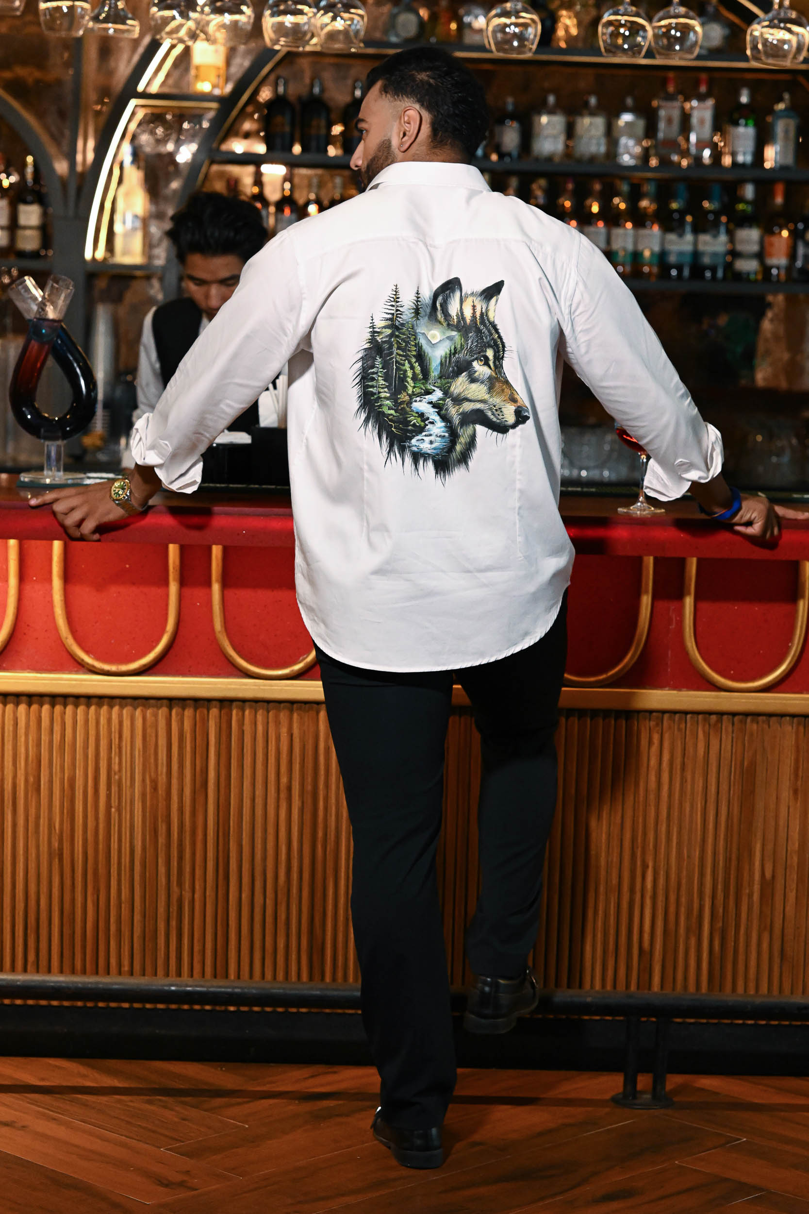 The front of the shirt carries a bold embroidered message — SAVE NATURE — in vibrant green, making a clear environmental statement. On the back, a stunning hand-painted wolf emerges from a forest scene, seamlessly blending with flowing rivers and towering pine trees. The design captures the wolf’s watchful gaze, symbolizing protection and harmony within nature. Rich, earthy tones and fine detailing bring depth, making it a wearable call for conservation. It’s a perfect blend of art and advocacy, turning fashion into a voice for the wild.