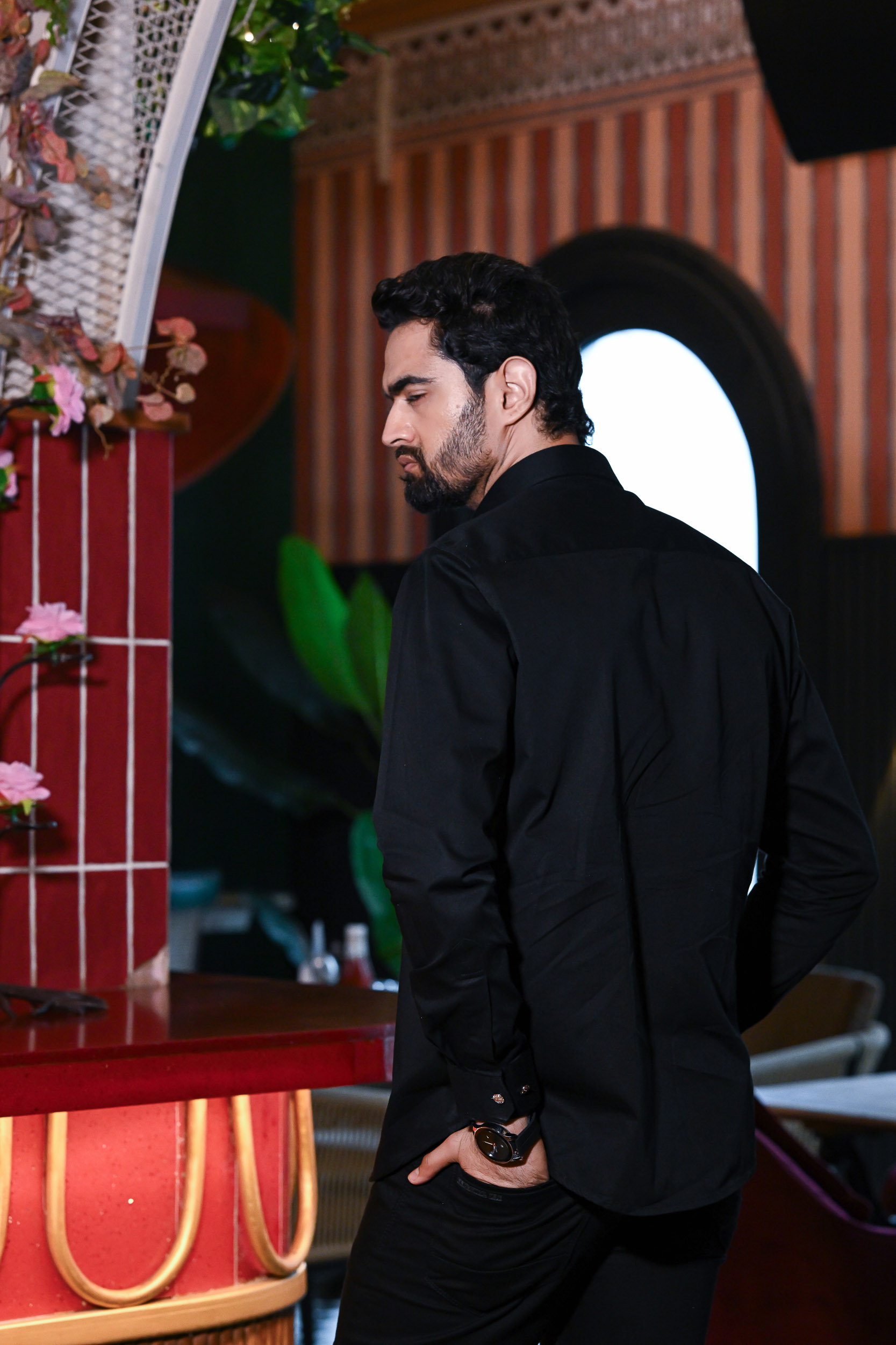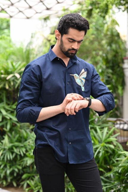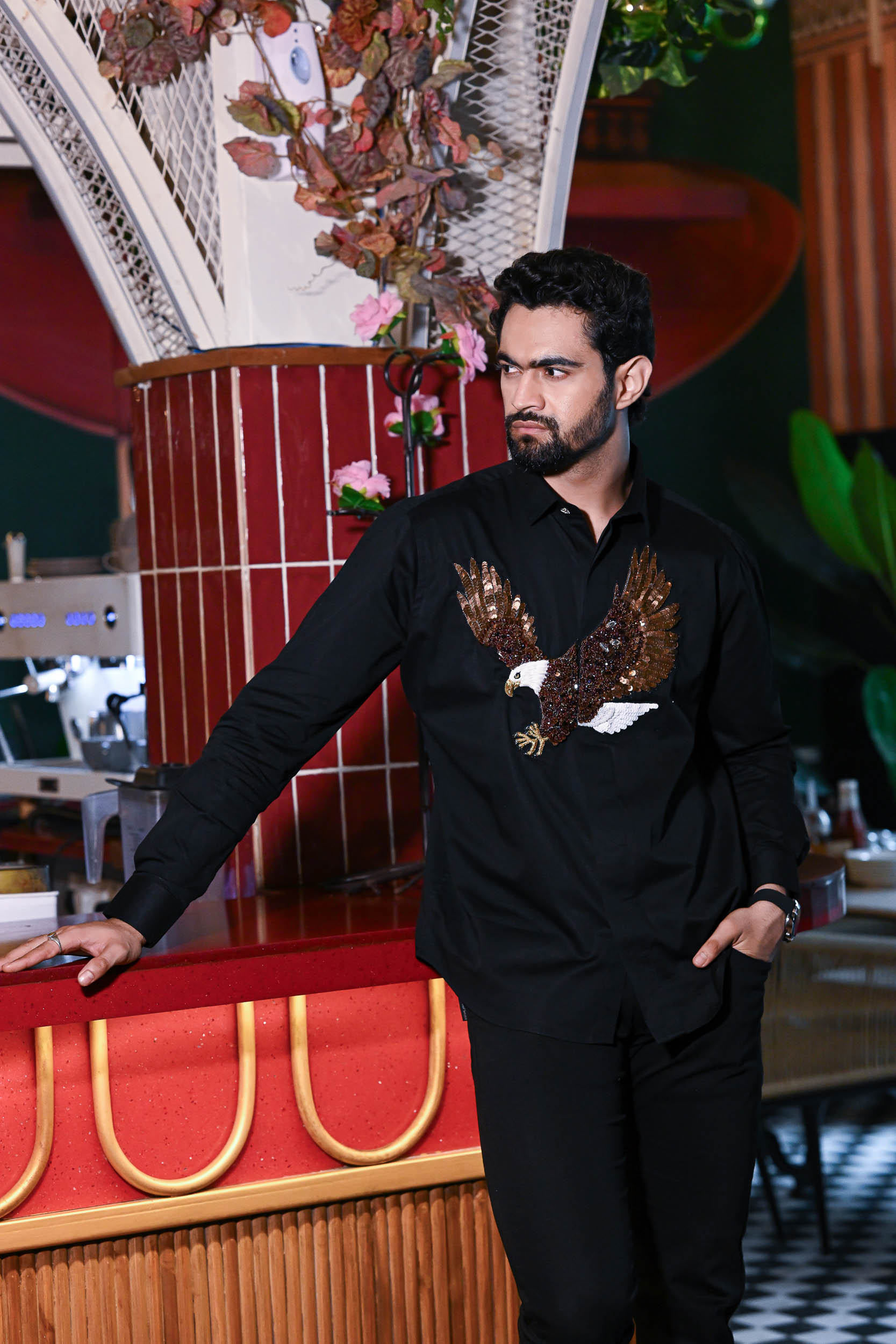 This striking black shirt features a bold, hand-embroidered eagle in mid-flight. The wings shimmer with layered bronze and copper sequins, giving a dynamic sense of movement. The eagle’s head and talons are finely detailed in white, yellow, and gold beadwork. Rich textures and reflective embellishments create a lifelike, three-dimensional effect. A powerful statement piece symbolizing strength, freedom, and confidence.