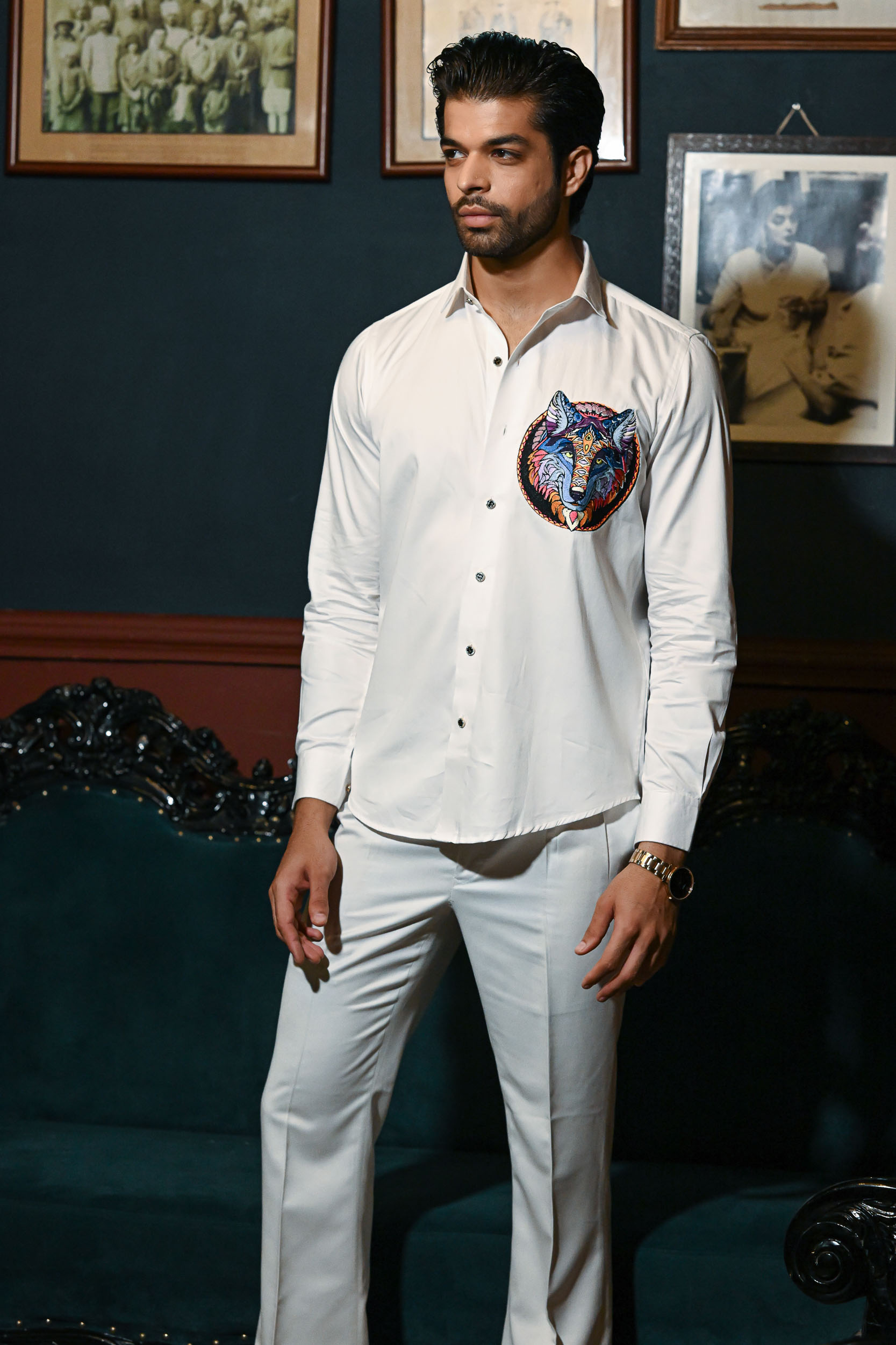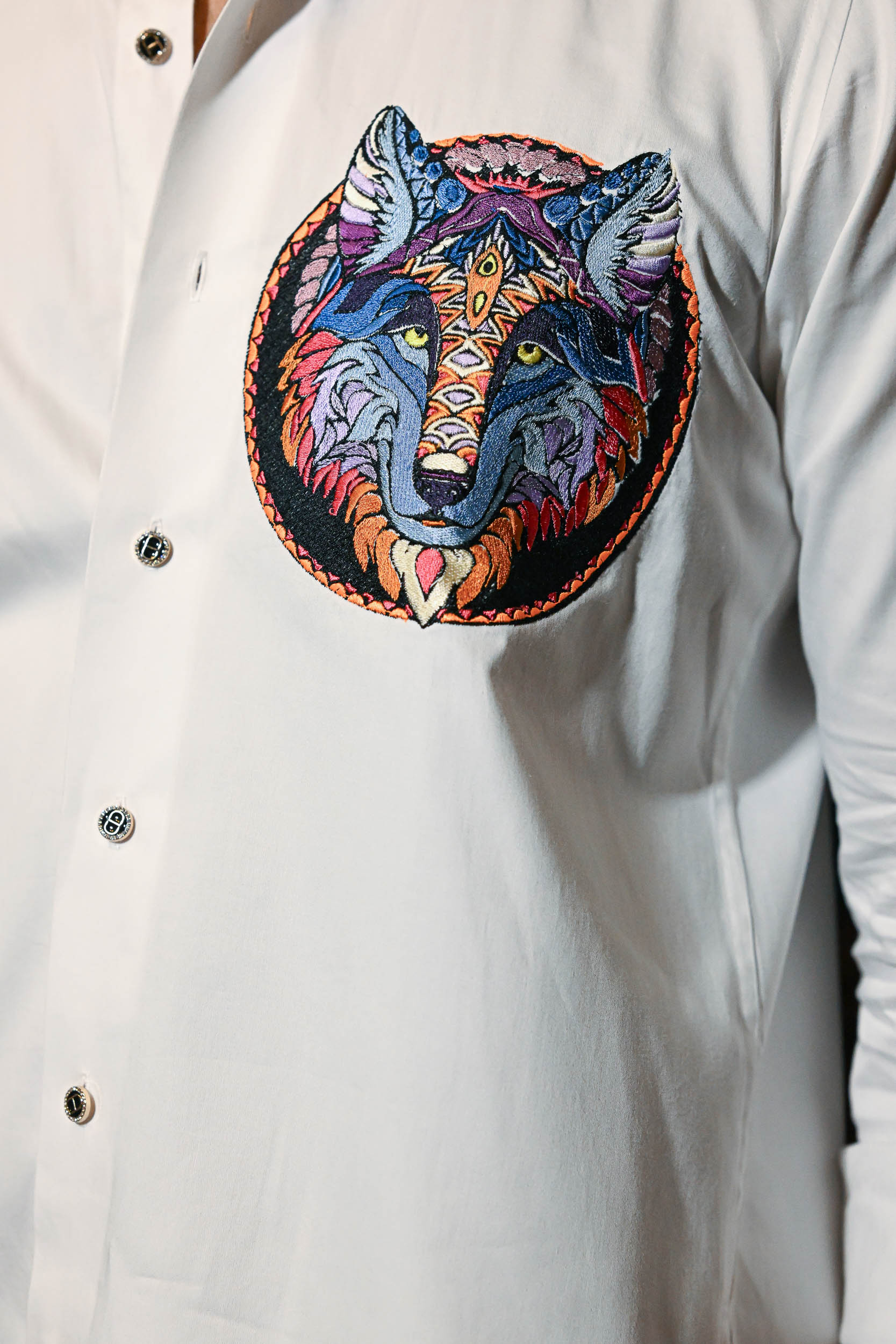 The embroidery features a striking wolf head rendered in vivid, contrasting colours. Intricate geometric patterns add a tribal and mystical touch to the design. The wolf’s piercing yellow eyes create an intense and captivating focal point. A circular border frames the artwork, enhancing its symmetry and visual impact. The combination of cool blues and warm oranges gives the design both depth and balance.