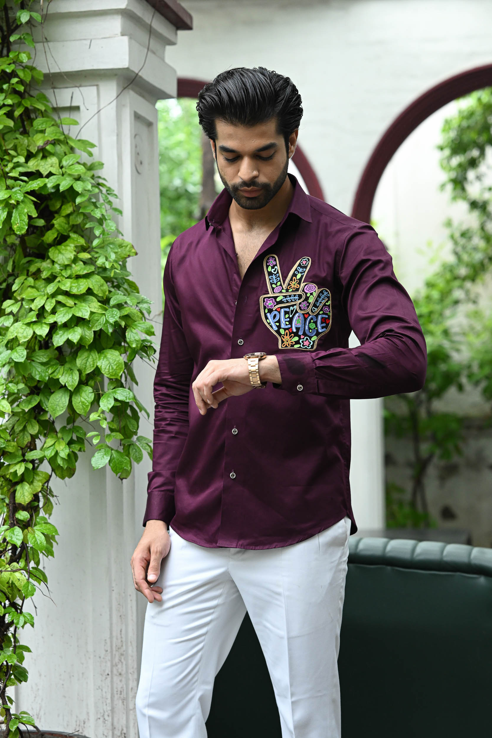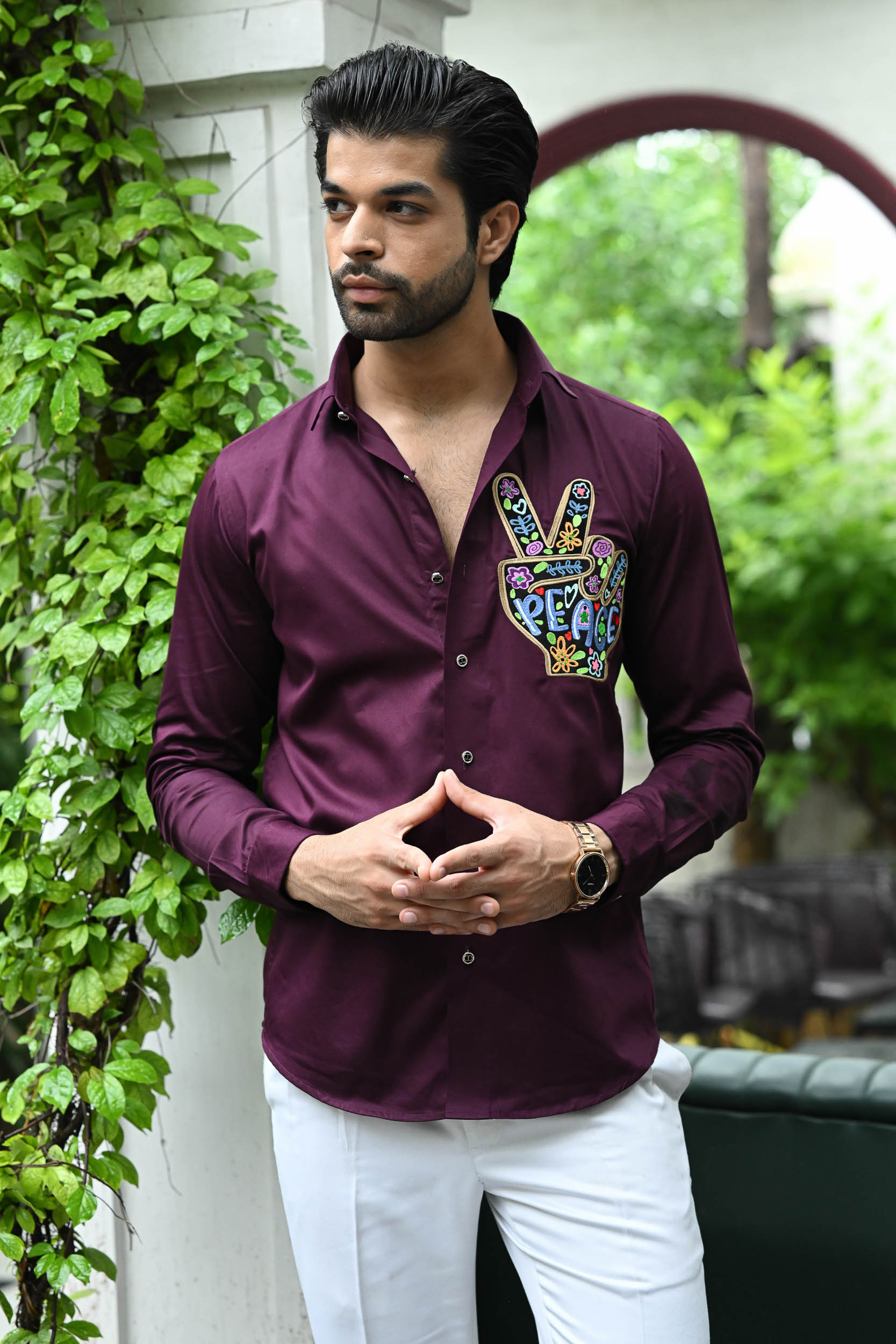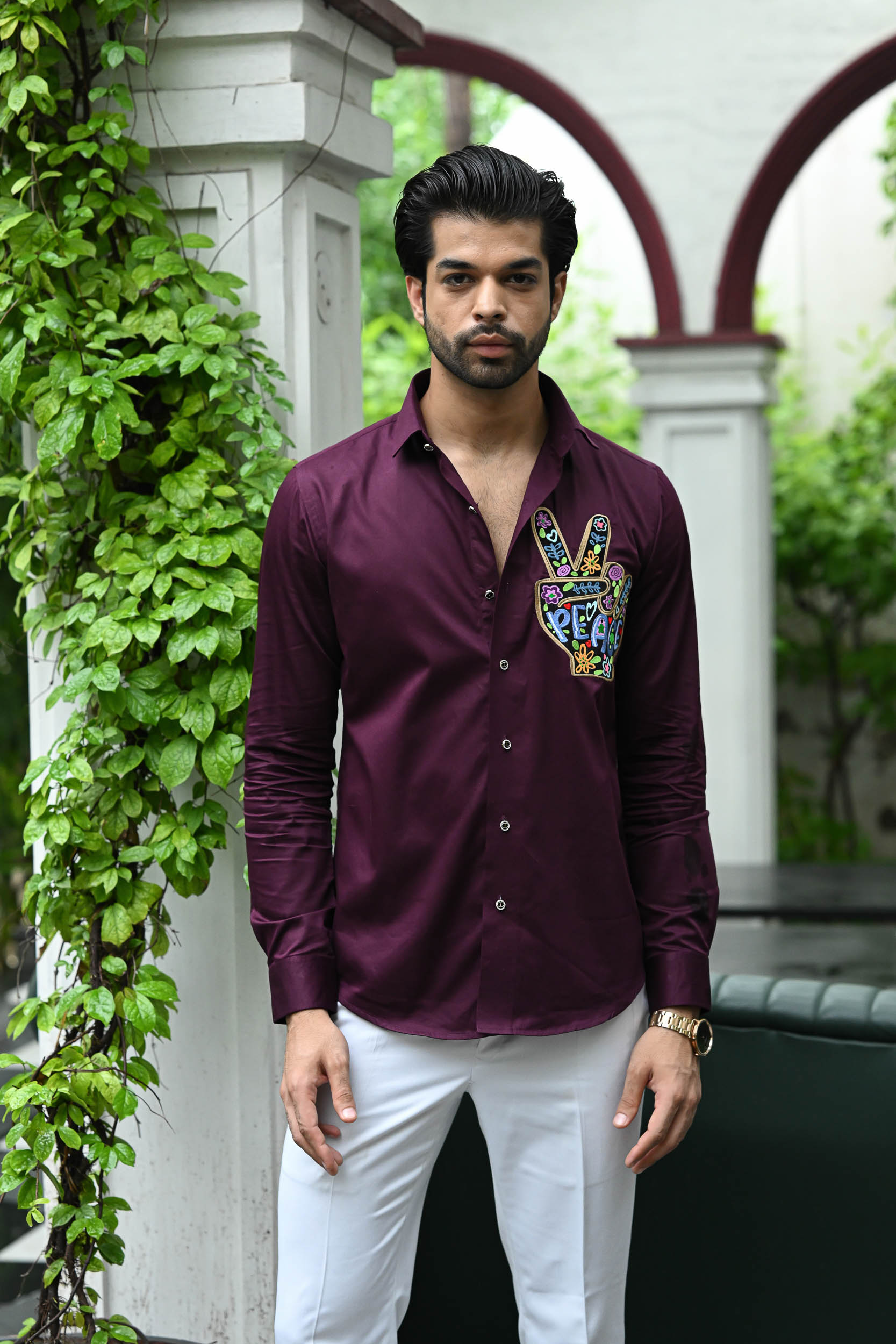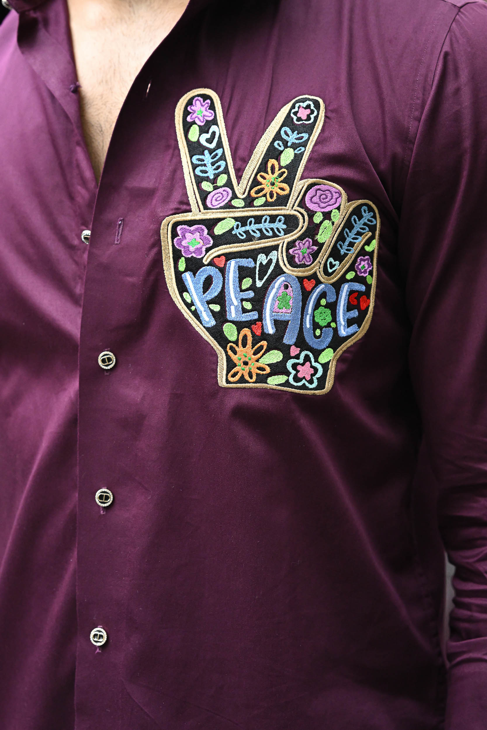 The embroidery features a vibrant peace hand gesture filled with floral and heart motifs. The word “PEACE” is boldly stitched in colourful letters, enhancing the positive message. Bright greens, purples, oranges, and blues create a cheerful, eye-catching design. Intricate detailing within the shapes adds depth and a playful, bohemian feel. Perfect for promoting love and harmony, it’s a bold style statement on a deep maroon shirt.