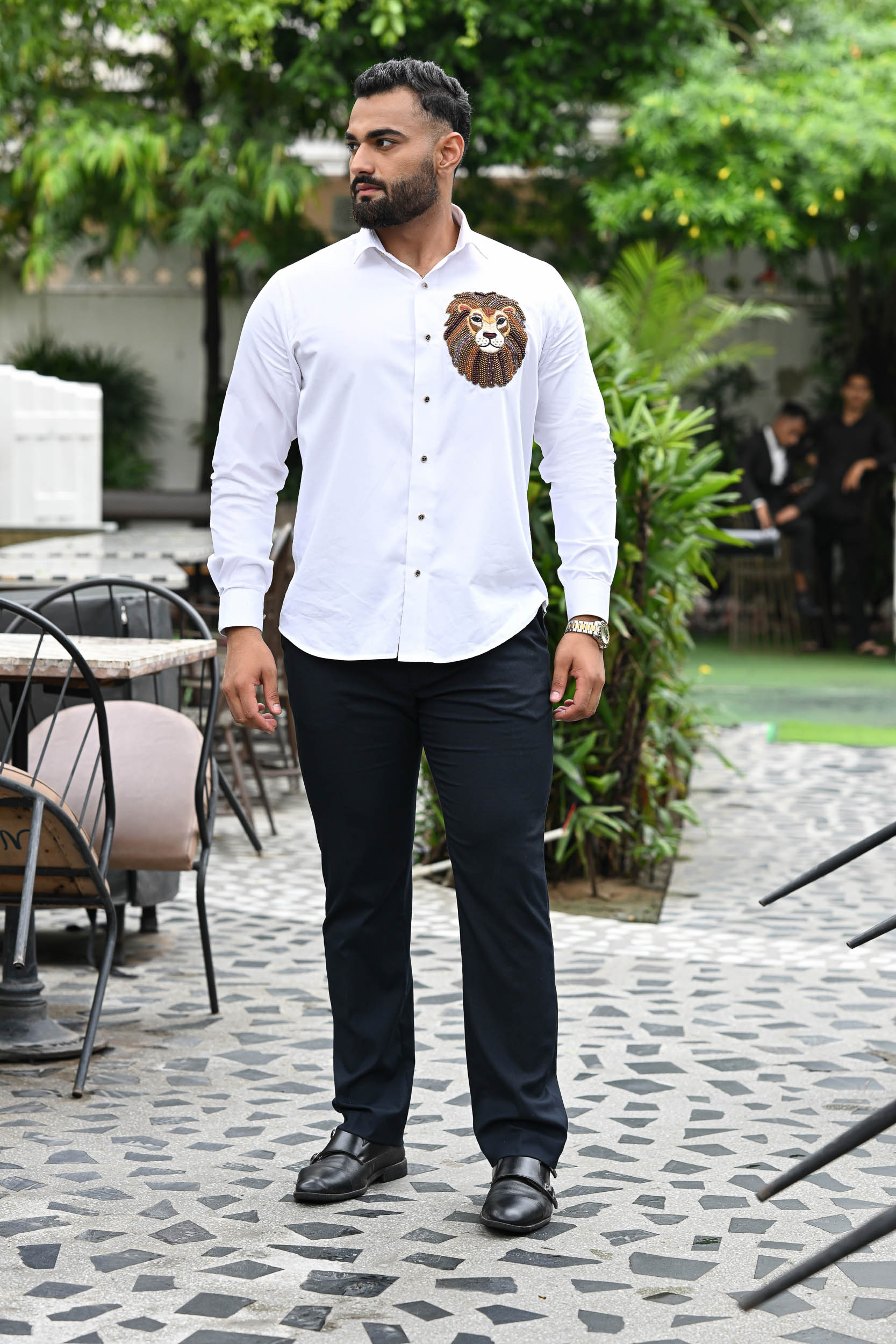 The shirt boasts an intricate beaded lion face, radiating strength and confidence. Rich shades of gold, brown, and amber beads create a lifelike mane full of depth and texture. Fine embroidery highlights the lion’s expressive eyes and facial details. The shimmering beadwork catches light, adding a luxurious dimension to the design. This piece blends bold animal symbolism with elegant craftsmanship for a powerful fashion statement.