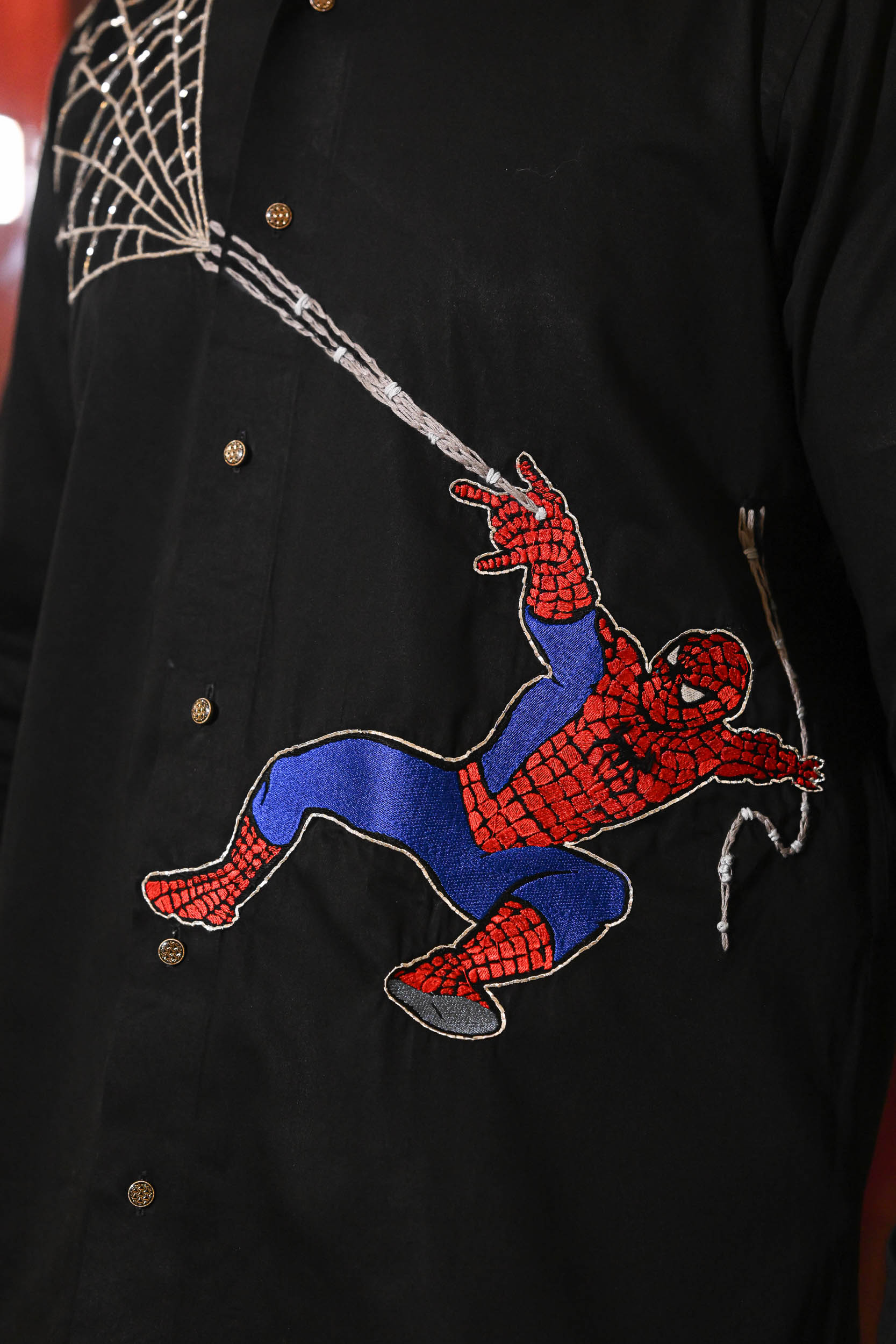 The embroidery features Spider-Man in his iconic red-and-blue suit, mid-action shooting a web. A large, detailed spiderweb spreads across the shoulder, adding dynamic movement to the design. The vivid colours of Spider-Man contrast sharply against the black shirt. The placement creates the illusion of Spidey swinging right across the chest. Perfect for comic fans, it combines pop culture with bold streetwear flair.