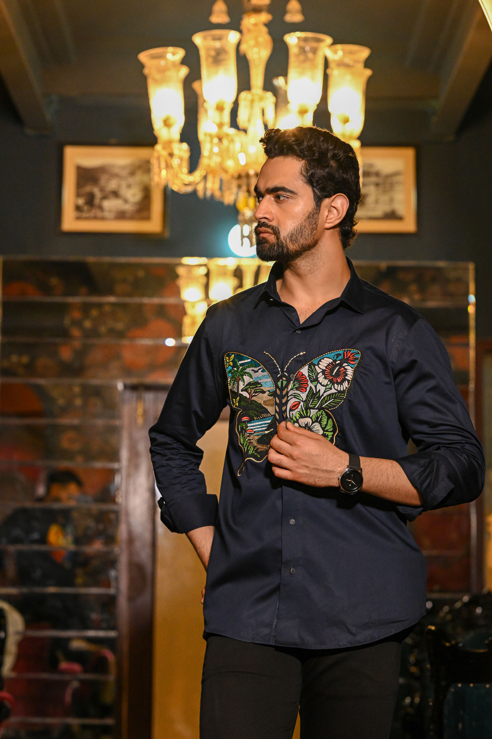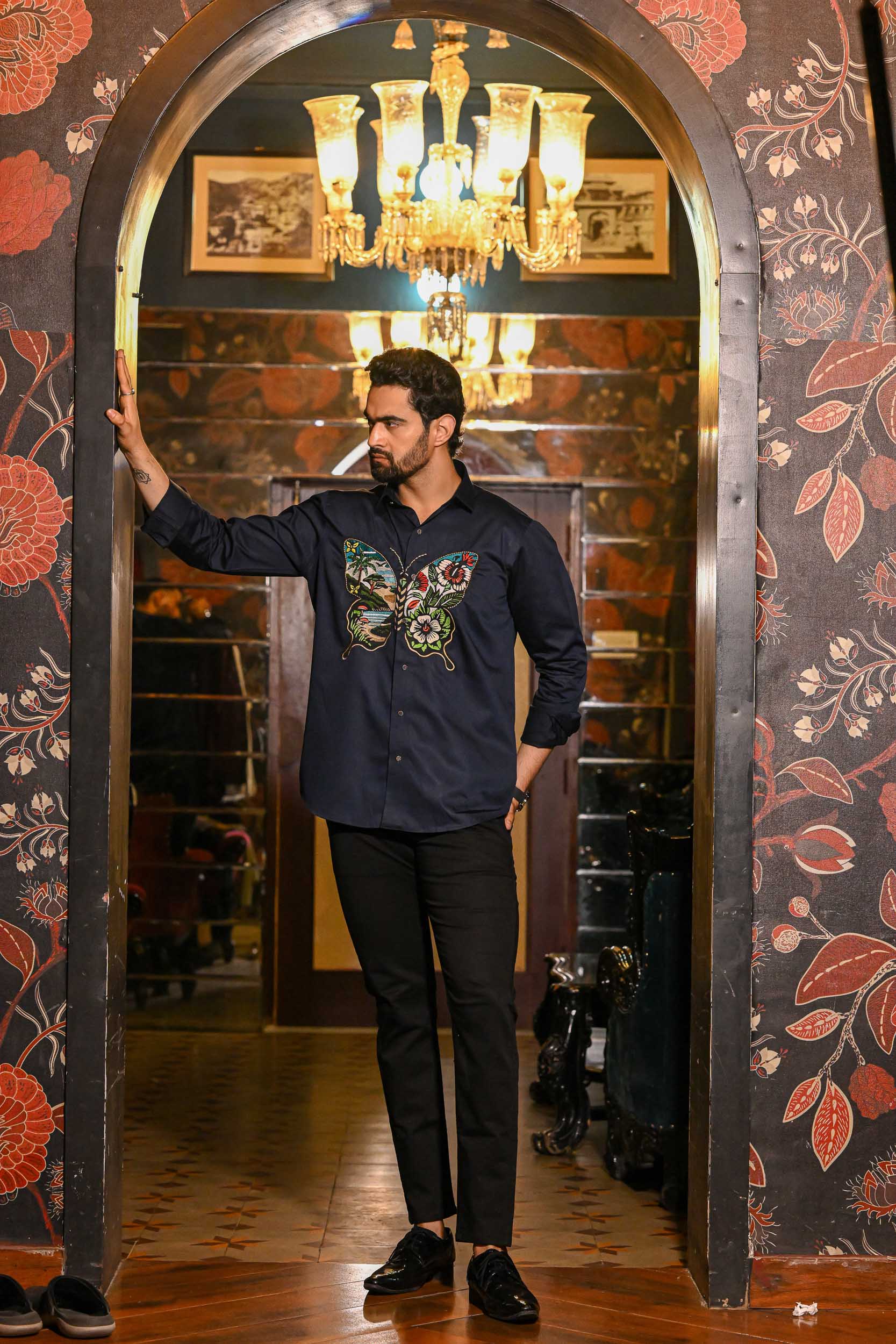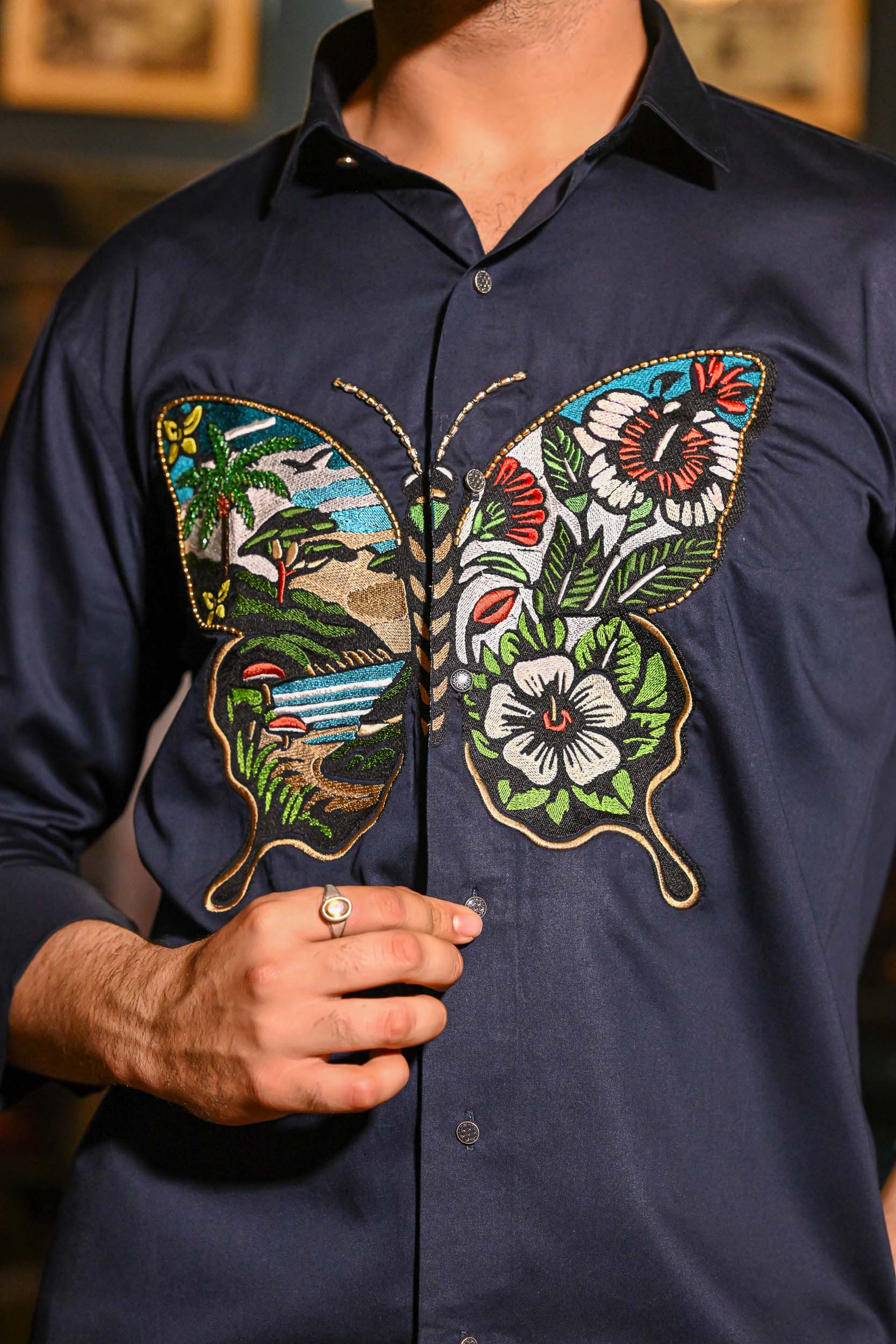 The embroidery forms a majestic butterfly; its wings painted with vivid landscapes and floral motifs. On one wing, tropical beaches, palm trees, and serene waters create a scenic escape. The other wing bursts with large, colourful flowers and lush green leaves. Golden outlines add a touch of elegance, making the design pop against the deep navy shirt. The piece captures the harmony of nature — where land, sea, and blossoms unite in flight.